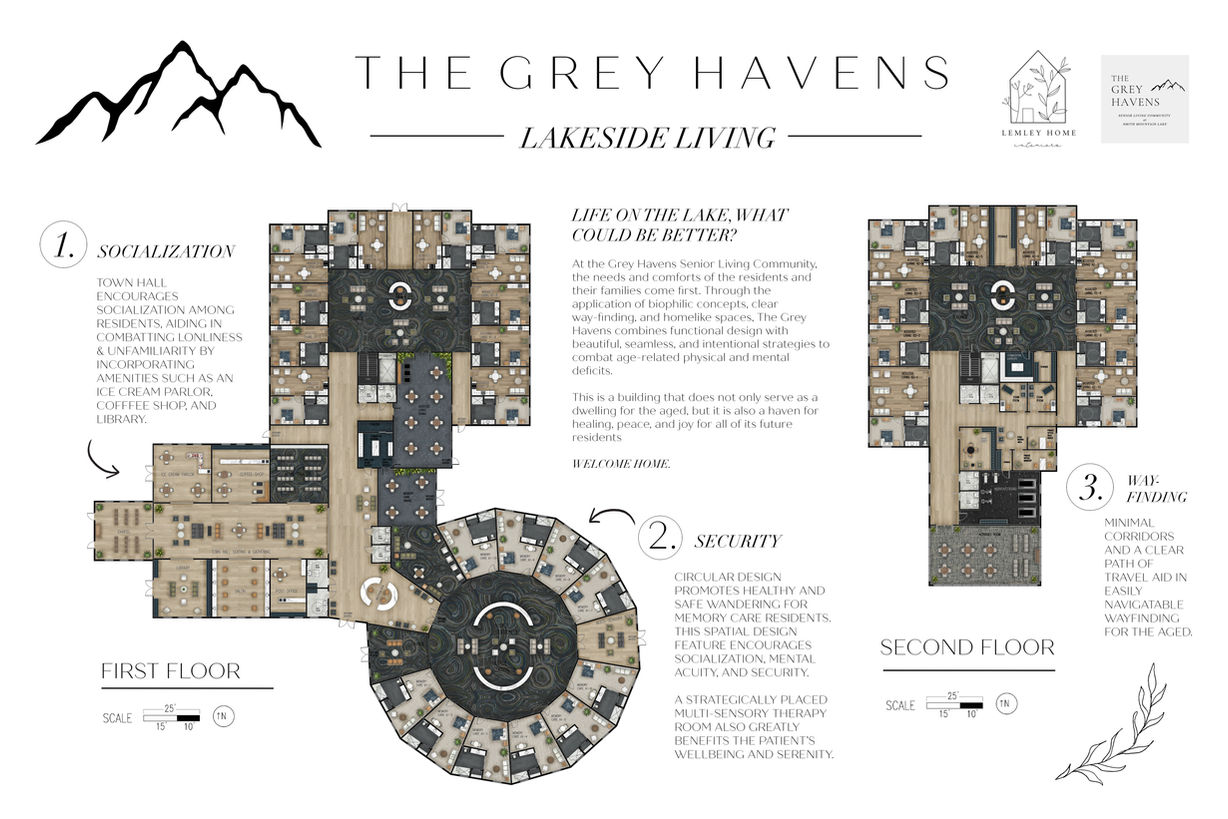 The final phase of this project included a completed render of the final floor plan (completed on Adobe Photoshop), finished design boards highlighting key features of the senior living facility, and blocks of type explaining and detailing the design decisions that were made in executing this building and its finishes.